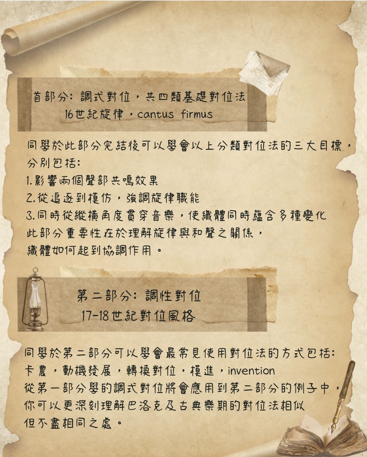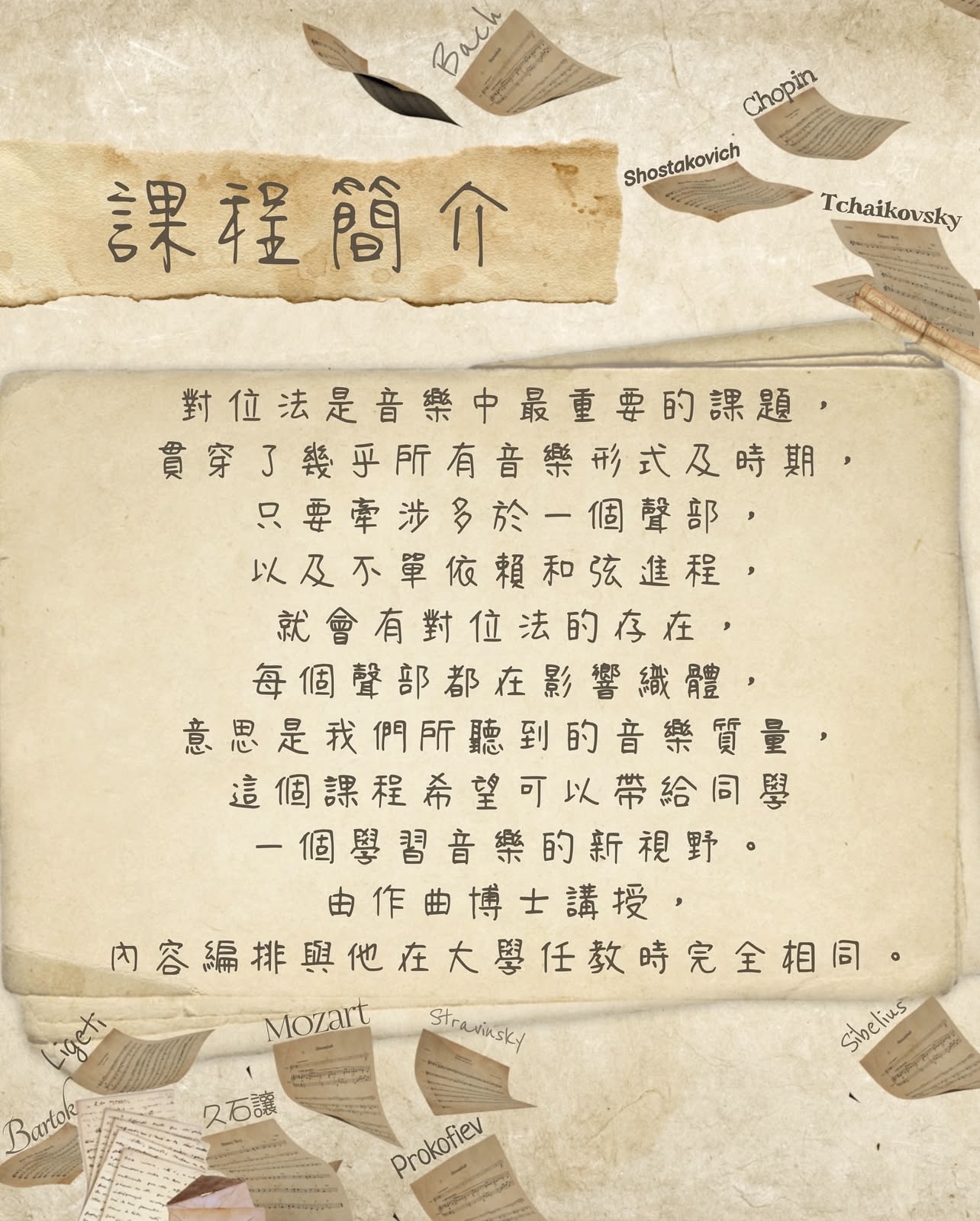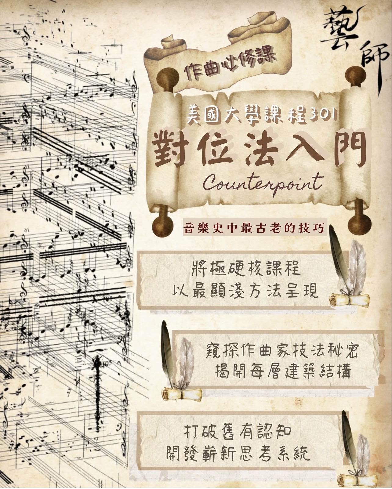 - 現代應用延伸: 探討對位思維在當代音樂、影視配樂、流行與爵士創作中的多樣應用,讓古典訓練轉化為現代創作力。