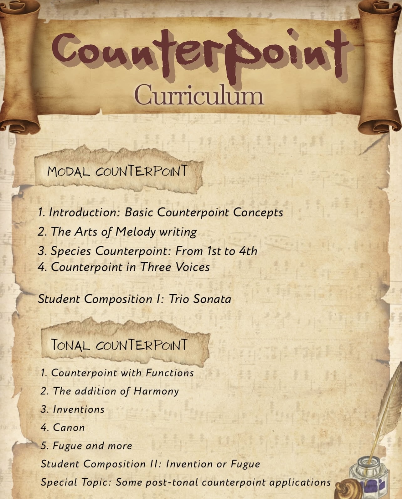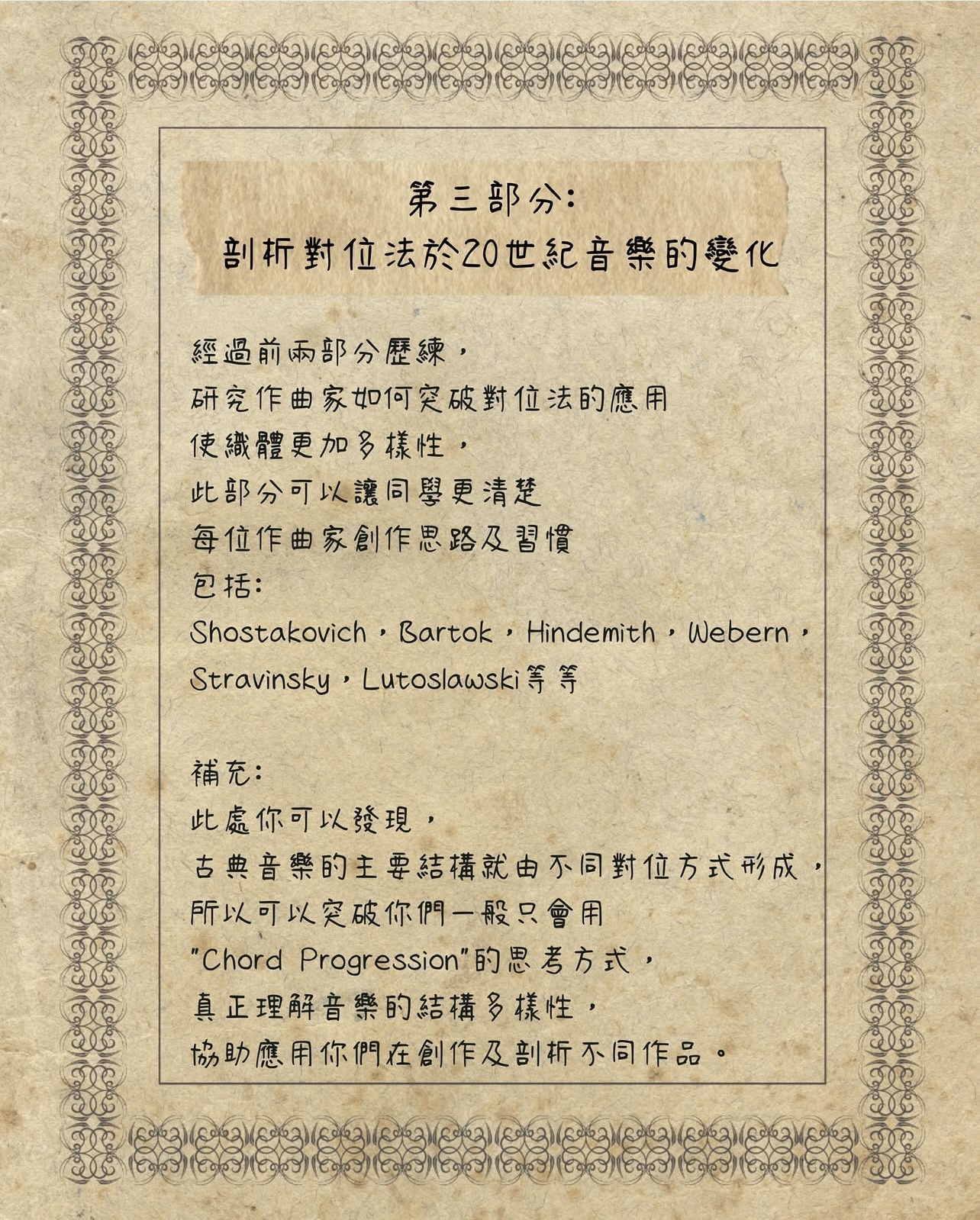- 正統系統教學: 從嚴格對位(Species Counterpoint)五大類型出發,建立清晰且穩固的聲部進行概念,為進一步創作奠定堅實基礎。
