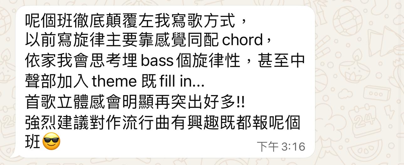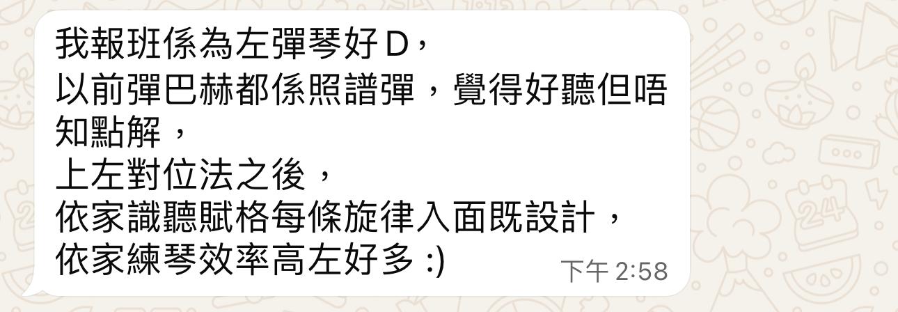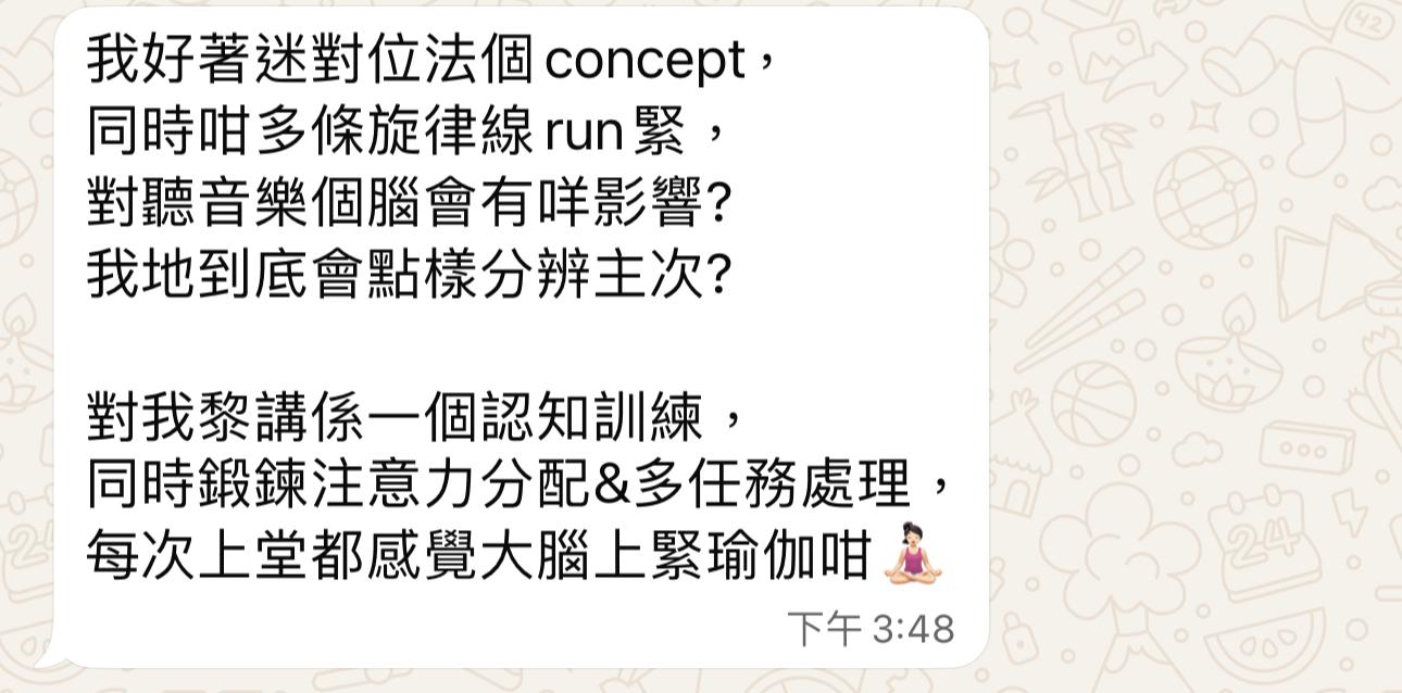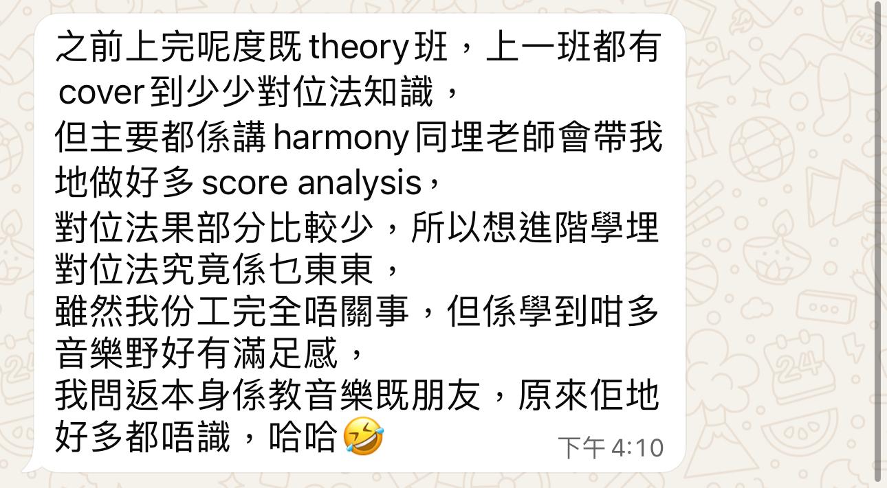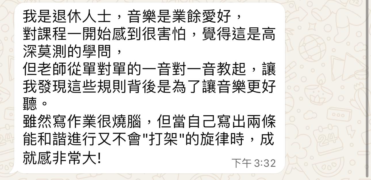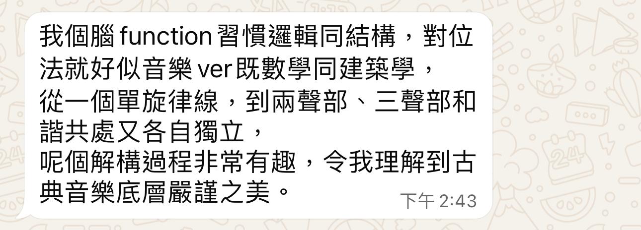 - 實作與創意結合: 課程設有大量寫作練習與個別修改指導,從二聲部至四聲部,最終完成創意曲(Invention)與小賦格(Fughetto)。