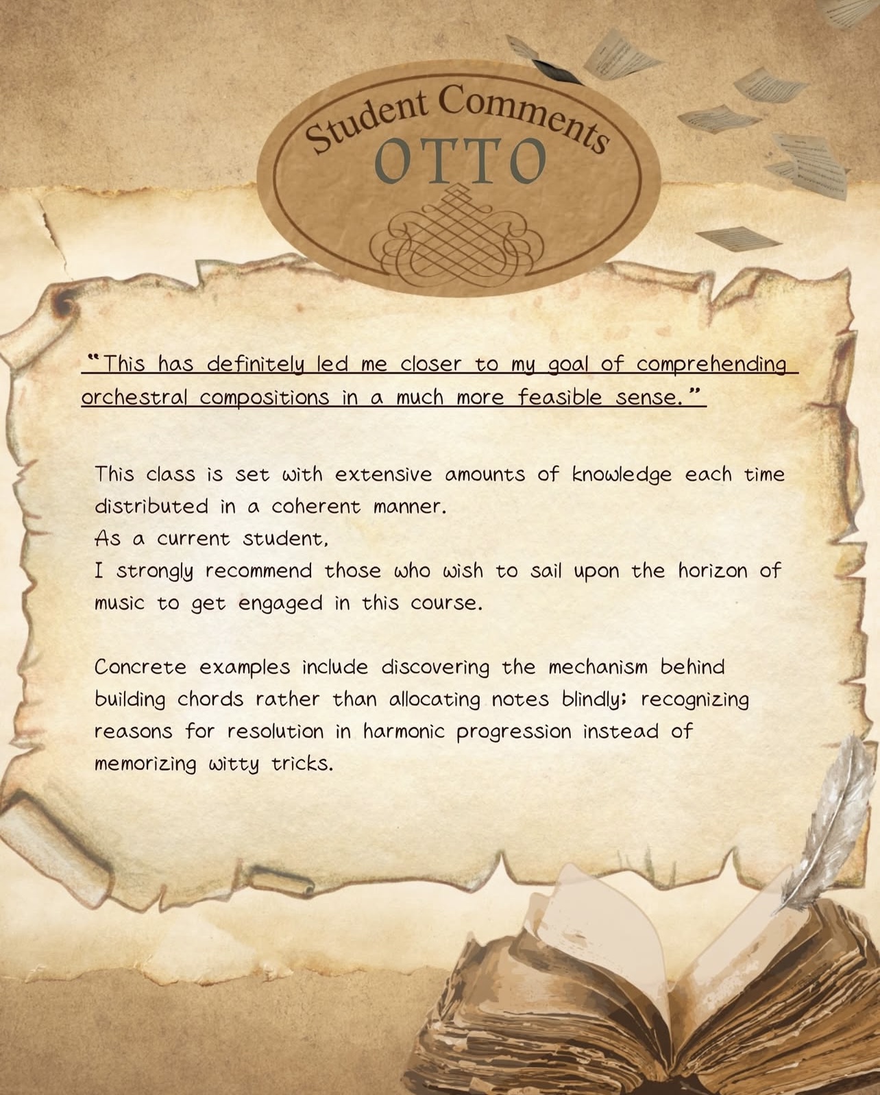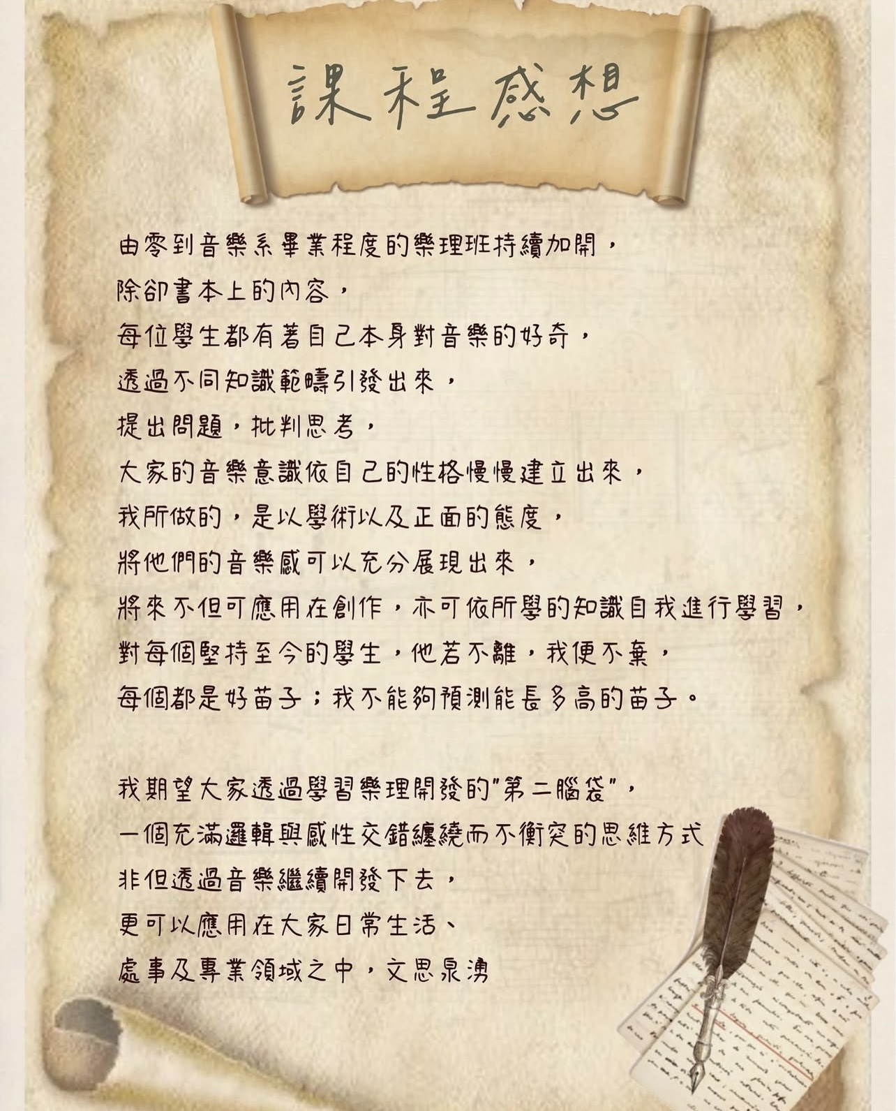 非一般主流樂理課程所能比擬,學生所學到的不僅是樂理本身,之後更可以應用所學在其他音樂活動,如分析推測其他音樂類型、調式、秒速看懂樂譜結構等等。