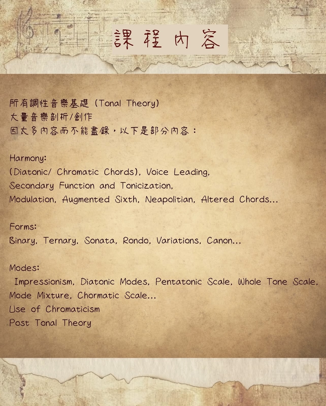 即使是最基本的樂理課程,但同時包括不同音樂體裁、結構、作曲規則、技巧、管弦樂編曲及對位法等等以上的進階理論,豐富學生全方位的音樂基礎。