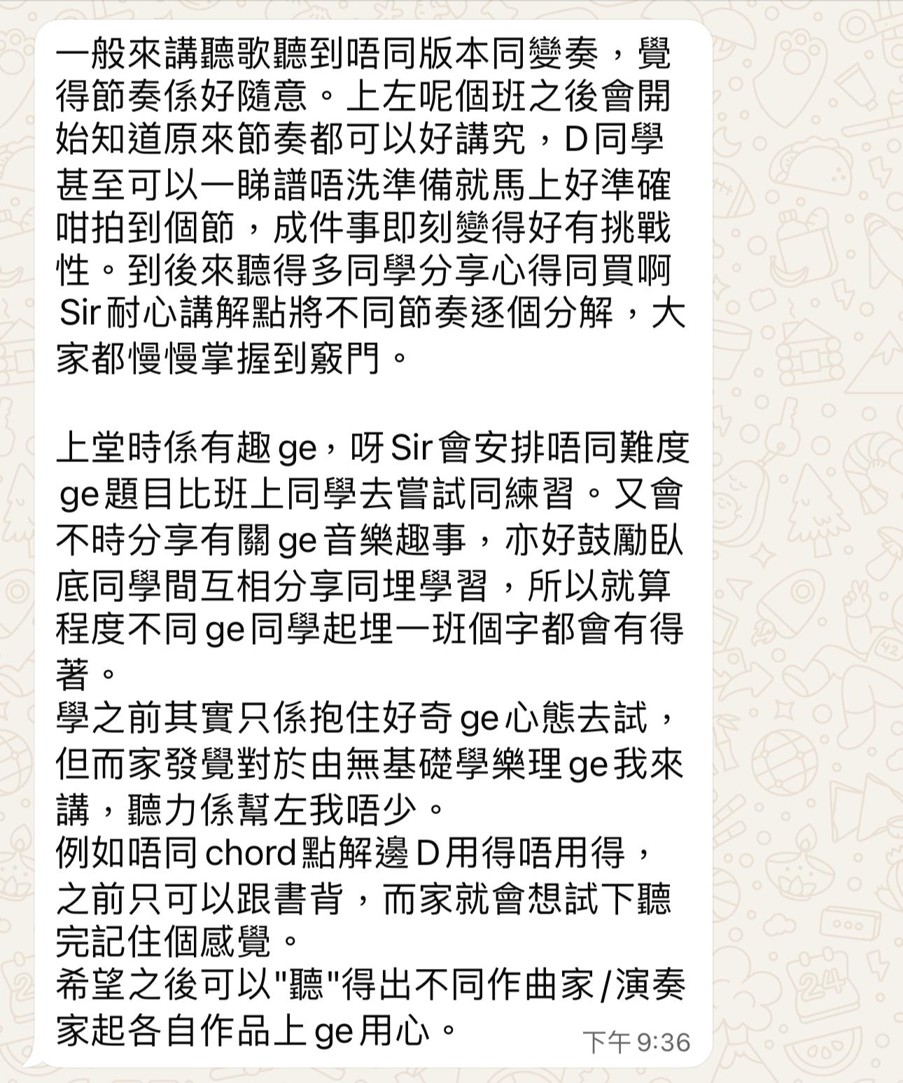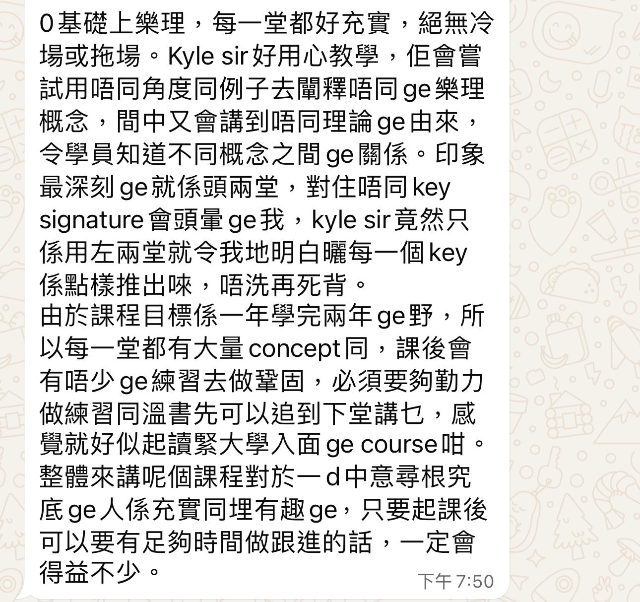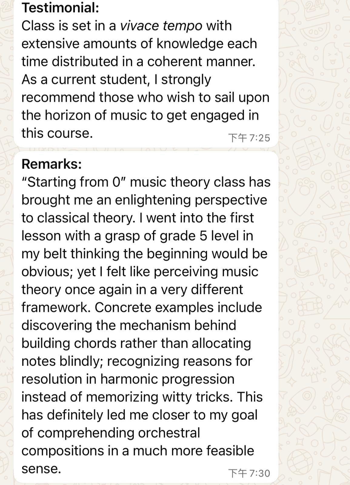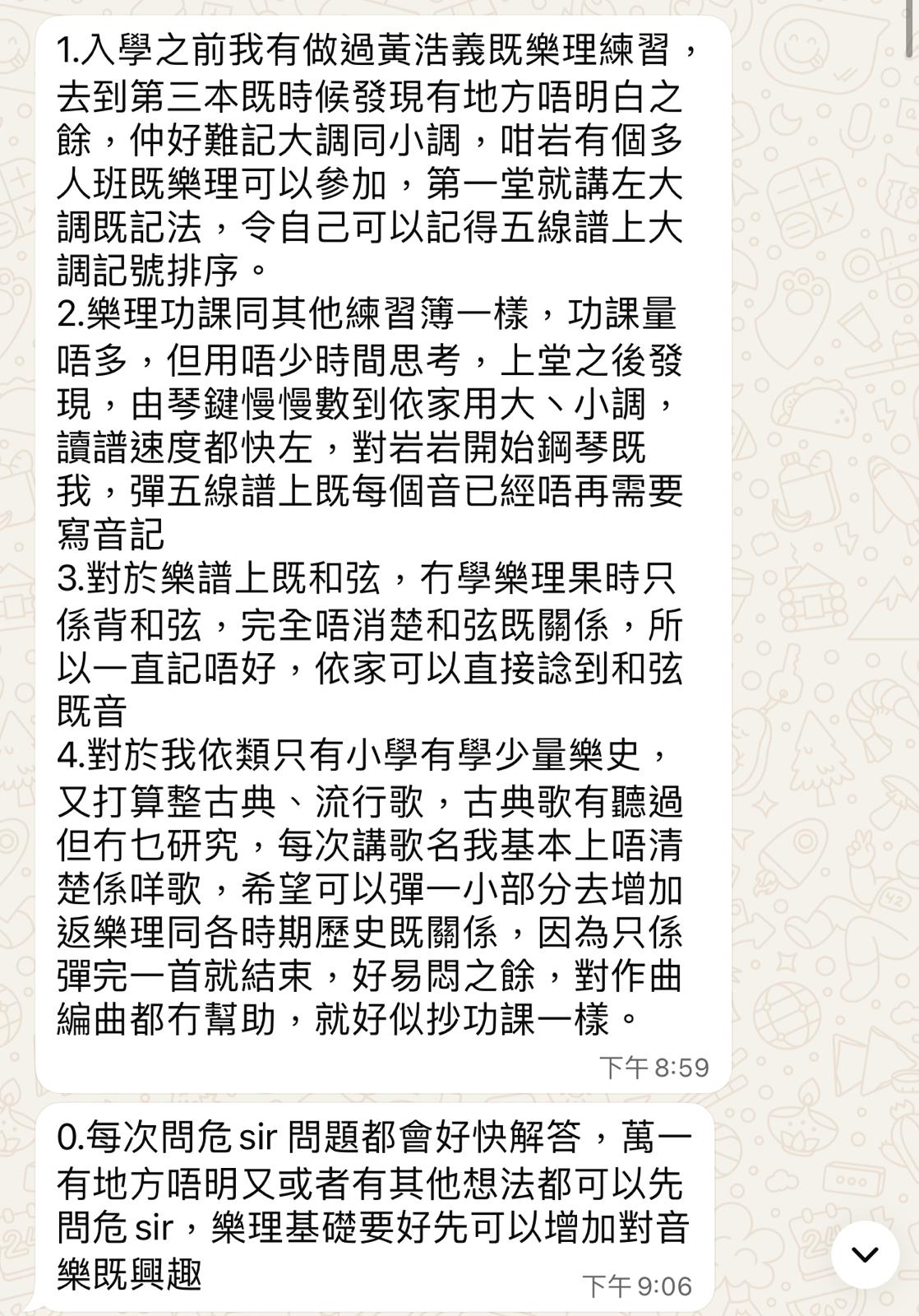會涉及不同與樂理相關的額外內容,如使用專業寫五線譜軟件、不同形式的作曲練習及功課、相關資料搜集等等。過往很多學員,開始時連基本五線譜亦不懂,但不消半年已經在跟我討論句式定義,Voice leading, Usage of nonchord tones及試寫室內樂音樂。