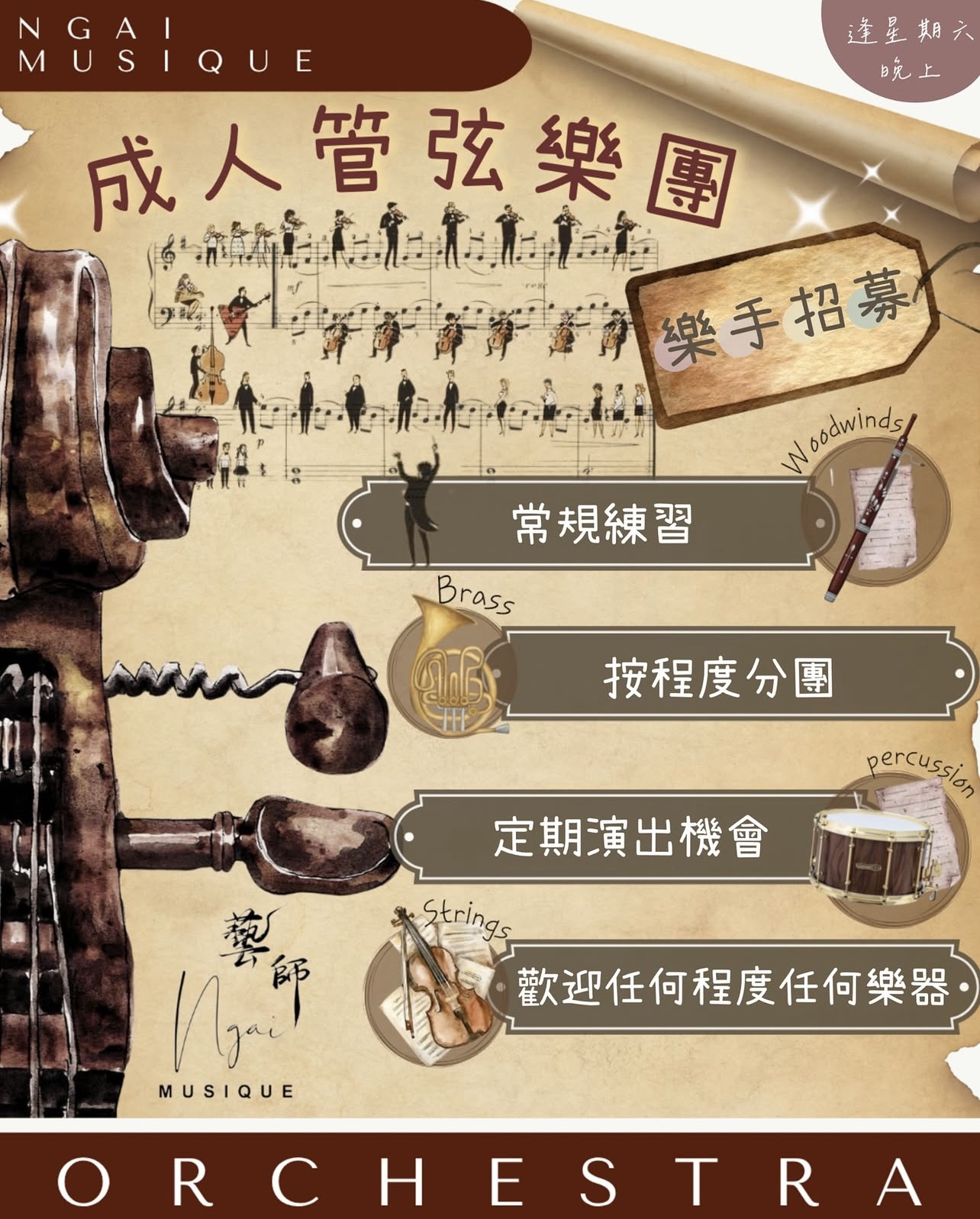 專為成人設計的專業管弦樂團,現正招募團員!無論您是重拾樂器的歸隊者,或是持續精進的音樂愛好者,這裡都歡迎您。我們理解您的忙碌,因此提供系統性的訓練與彈性的排練,讓您在工作之餘,也能享受合奏的純粹快樂與專業成長。
